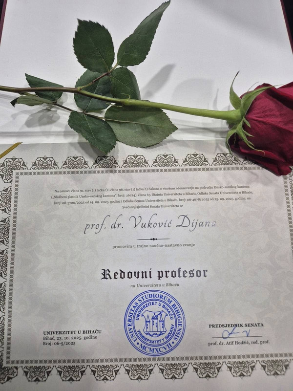 Na današnjoj svečanoj sjednici Senata Univerziteta u Bihaću, prof. dr. Dijana Vuković primila je zvanično priznanje povodom izbora u zvanje redovnog profesora, u koje je izabrana u julu ove godine.