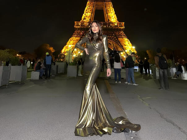 Haljina, s dugim rukavima i uskim krojem koji prati liniju tijela, s donjim dijelom u stilu sirene, naglašava njenu figuru, dok zlatna boja dodaje savršenu dozu glamura. Detalj koji čini ovo izdanje još impresivnijim je povezanost s pariskim noćnim svjetlima i magičnim tonovima Eiffelovog tornja, koji se prostire u pozadini.