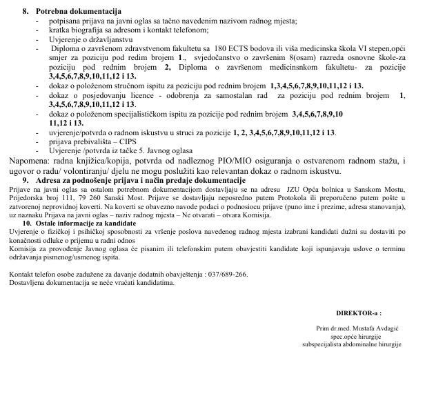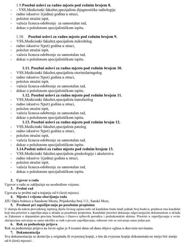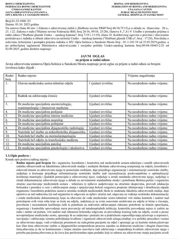 Opća bolnica u Sanskom Mostu raspisala je javni konkurs za prijem radnika u više radnih pozicija, uključujući medicinske specijaliste, tehničare i radnike na održavanju čistoće. Konkurs je raspisan u skladu sa Zakonom o zdravstvenoj zaštiti FBiH, Zakonom o radu, Uredbom o postupku prijema u radni odnos i Kolektivnim ugovorom za zdravstveni sektor Unsko-sanskog kantona.