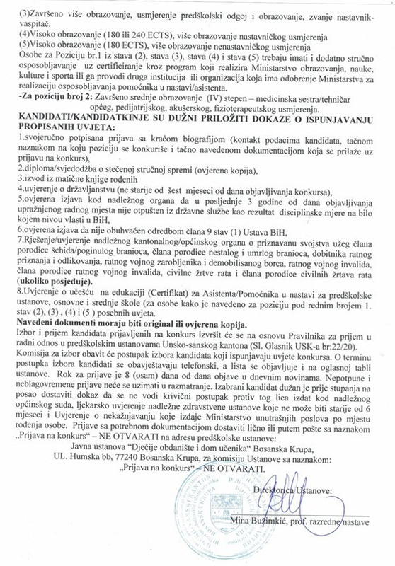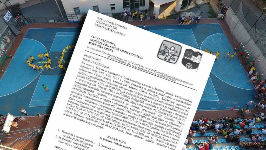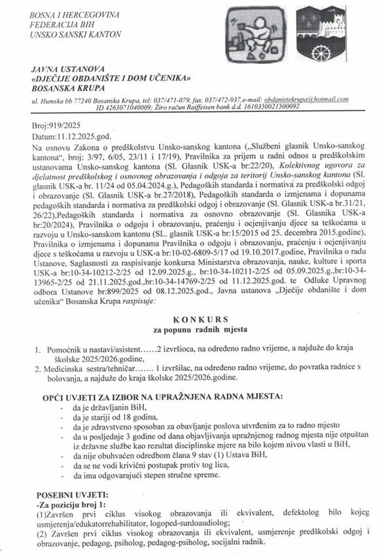 Javna ustanova „Dječije obdanište i dom učenika“ Bosanska Krupa objavila je konkurs za popunu radnih mjesta na određeno vrijeme u školskoj 2025/2026. godini. Konkurs je raspisan na osnovu relevantnih zakonskih i pedagoških akata Unsko-sanskog kantona, te prethodno pribavljenih saglasnosti Ministarstva obrazovanja, nauke, kulture i sporta USK-a.