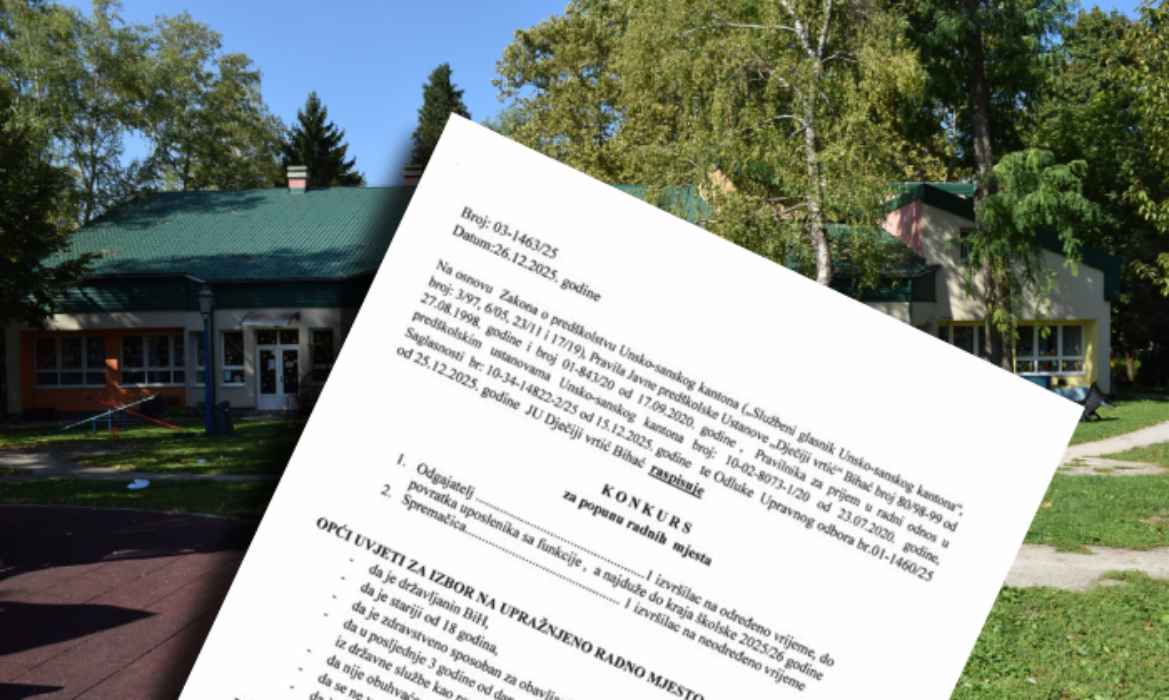 JU Dječiji vrtić Bihać raspisao je konkurs za prijem radnika u radni odnos, na osnovu važećih zakonskih i podzakonskih akata Unsko-sanskog kantona, kao i odluka nadležnih organa ustanove. Konkurs je objavljen u skladu sa Zakonom o predškolstvu Unsko-sanskog kantona, pravilnicima o radu i saglasnostima nadležnih institucija.