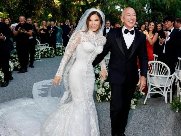 Jeff Bezos je nosio klasično crno odijelo istog brenda. U intervjuu za Vogue, Lauren je ranije otkrila da je Bezos želio vidjeti haljinu prije vjenčanja, ali ona je željela da to ostane iznenađenje: