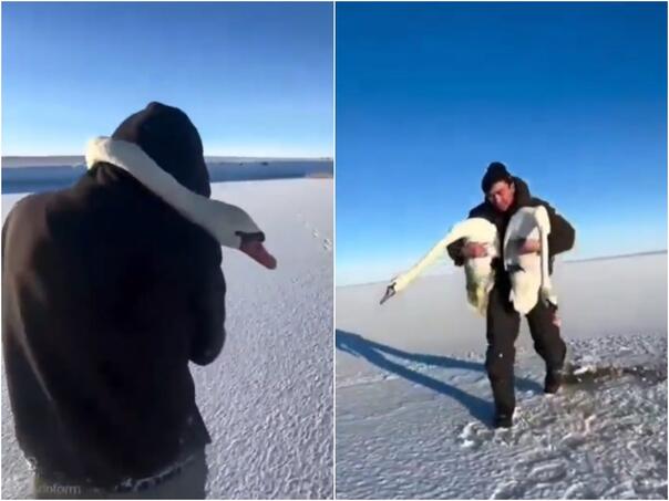 A Kazakhstani man saved a pair of swans from death on a frozen lake