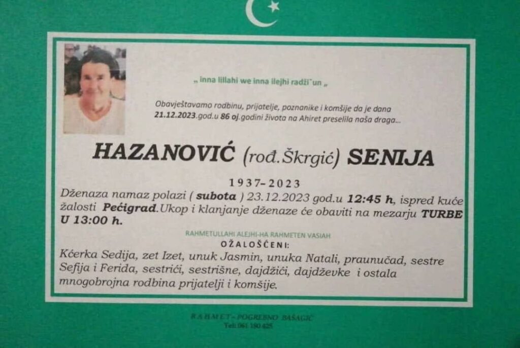 Obavještavamo rodbinu, prijatelje, poznanike i komšije da je dana 21.12.2023.god.u 86 oj.godini života na Ahiret preselila naša draga HAZANOVIĆ (rod. Škrgić) SENIJA.