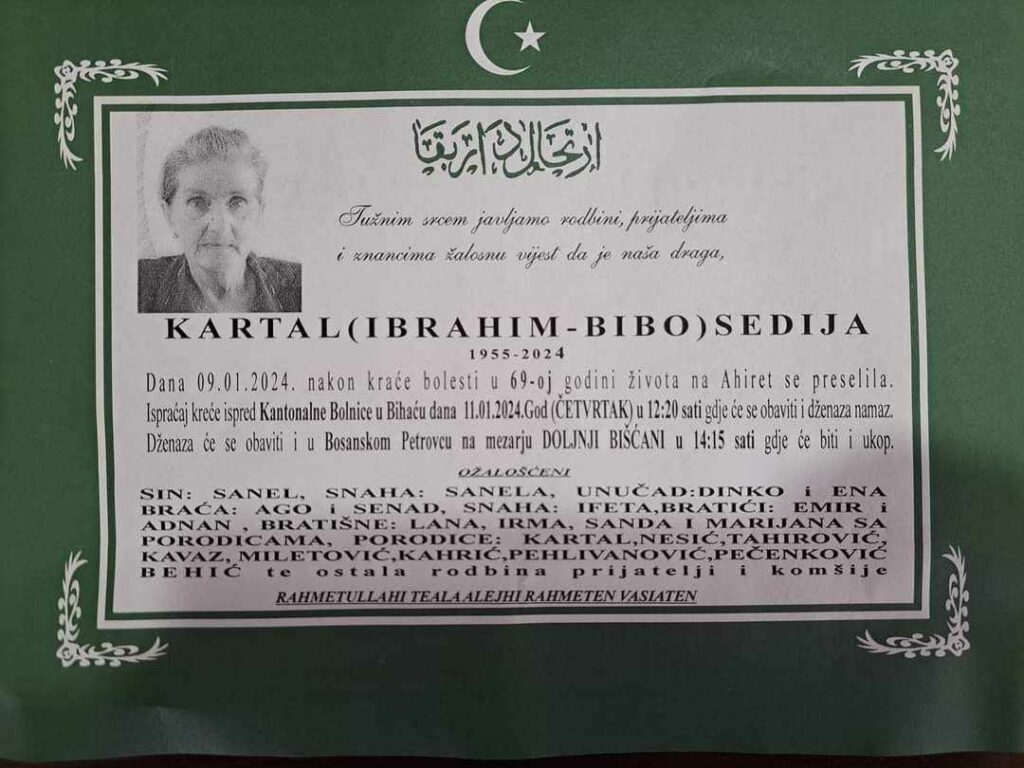 Tužnim srcem javljamo rodbini, prijateljima i znancima žalosnu vijest da je naša draga KARTAL (IBRAHIM-BIBO) SEDIJA dana 09.01.2024. nakon kraće bolesti u 69-oj godini života na Ahiret se preselila.