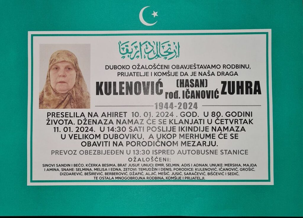 DUBOKO OŽALOŠĆENI OBAVJEŠTAVAMO RODBINU, PRIJATELJE I KOMŠIJE DA JE NAŠA DRAGA KULENOVIĆ (HASAN) rođ.IČANOVIĆ ZUHRA PRESELILA NA AHIRET 10. 01. 2024. GOD. U 80. GODINI ŽIVOTA.