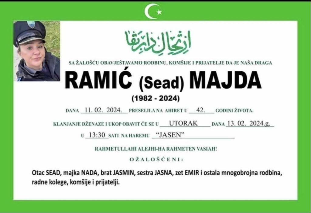 Poznat je termin dženaze Majdi Ramić, pripadnici Policijske stanice Jablanica, Policijske uprave Konjic, koja je danas ispred svoje porodične kuće izvršila samoubistvo.