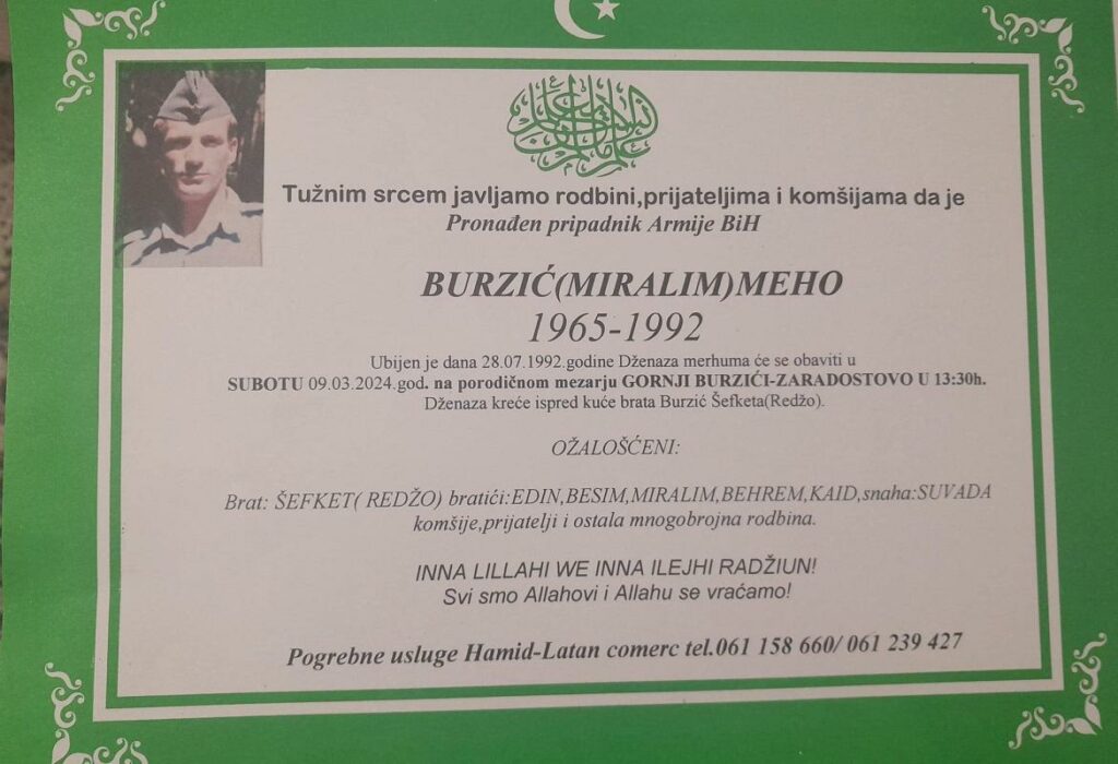 Tužnim srcem javljamo rodbini, prijateljima, komšijama i poznanicima žalosnu vijest da je pronađen pripadnik Armije BiH Burzić (Miralim) Meho.
