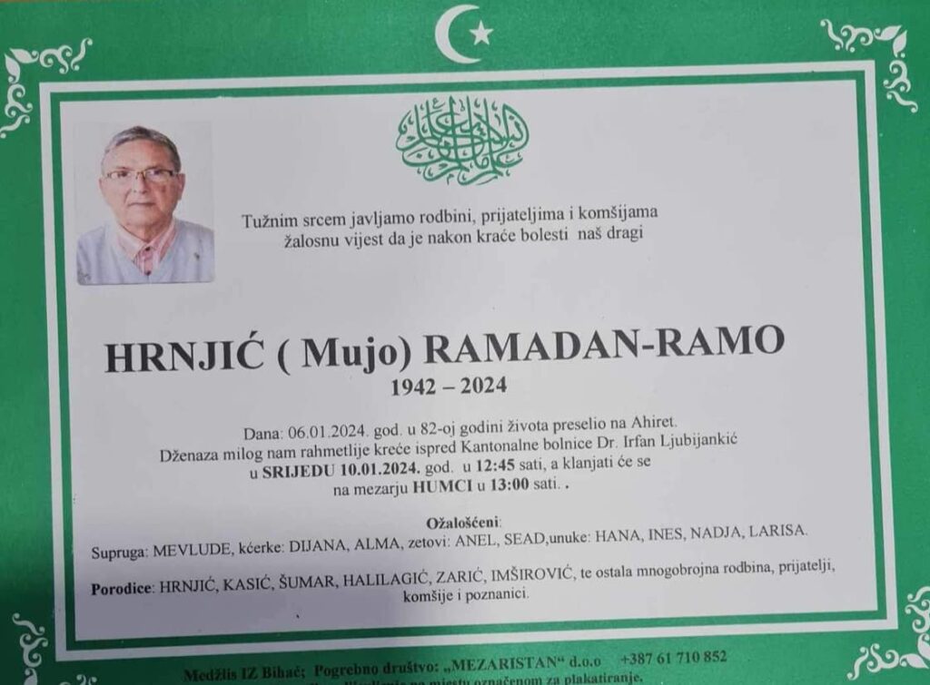 Tužnim srcem javljamo rodbini, prijateljima i komšijama žalosnu vijest da je nakon kraće bolesti naš dragi HRNJIĆ (Mujo) RAMADAN-RAMO dana: 06.01.2024. god. u 82-oj godini života preselio na Ahiret.