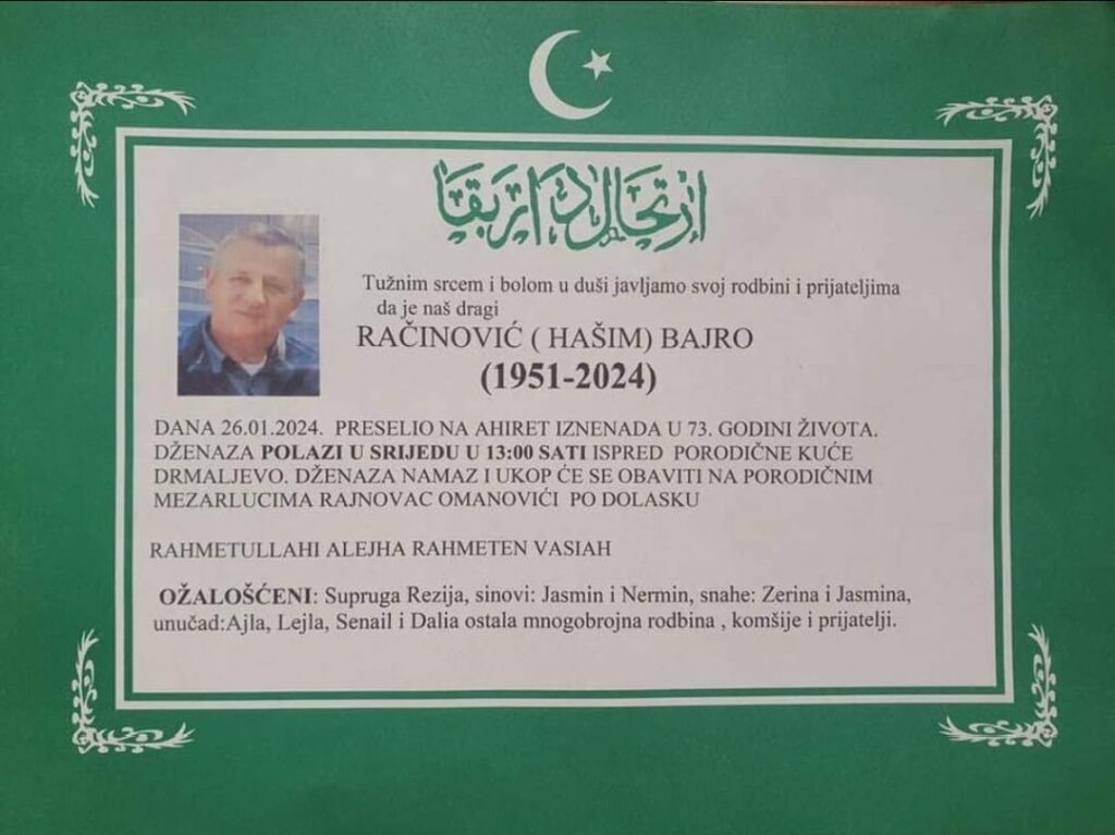 Tužnim srcem i bolom u duši javljamo svoj rodbini i prijateljima da je naš dragi RAČINOVIĆ (HAŠIM) BAJRO DANA 26.01.2024. PRESELIO NA AHIRET IZNENADA U 73. GODINI ŽIVOTA.
