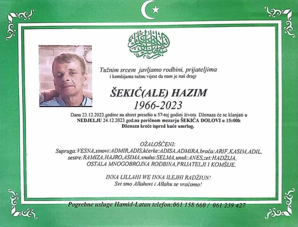 Dženaza će se klanjati u NEDJELJU 24.12.2023.god.na poričnom mezarju ŠEKIĆA DOLOVI u 15:00h Dženaza kreće ispred kuće umrlog.