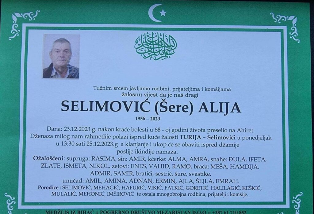 Obavještavamo rodbinu, prijatelje i poznanike da je dana 23.12.2023. g. nakon kraće bolesti u 68-oj godini života preselio na Ahiret Selimović (Šere) Alija.