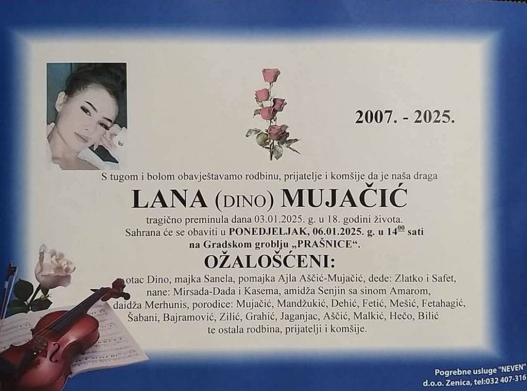 Lana Mujačić (17), koja je zadobila teške povrede u saobraćajnoj nesreći u mjestu Lašva kod Zenice, podlegla je povredama u Kantonalnoj bolnici Zenica. Njena prerana smrt zavila je u crno porodicu, prijatelje i cijelu zajednicu, koja se ujedinila u naporima da joj pomogne tokom borbe za život.