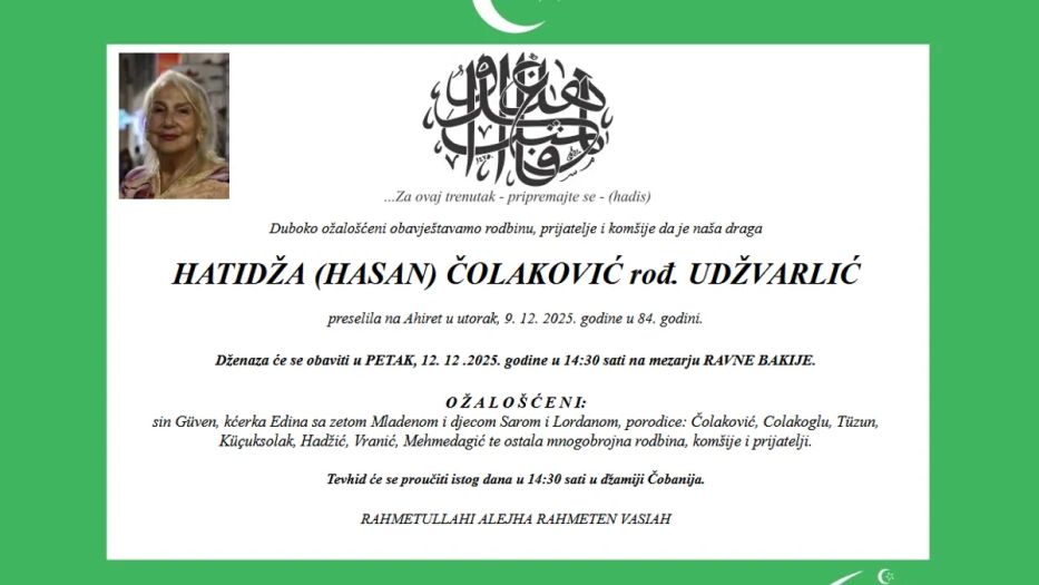 Dženaza će se obaviti u petak, u 14.30 sati na mezarju Ravne Bakije.
