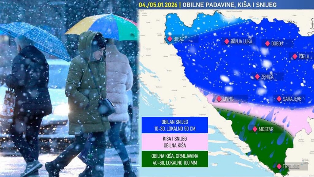 Dijelovi jugozapadne Bosne, sjevera Hercegovine i jugoistoka Bosne nalazit će se na granici između kiše i snijega. Ipak, u tim krajevima se većinom očekuje kiša, koja lokalno može biti i obilna.