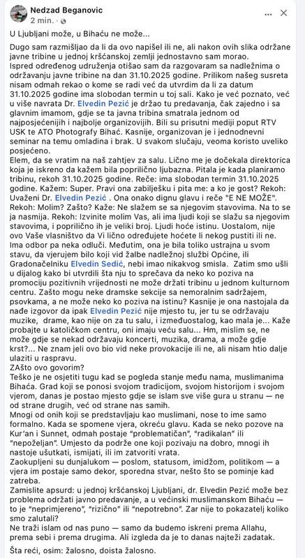 Apsurd situacije postaje još jasniji kada se uporedi s Ljubljanom – u kršćanskoj zemlji Pezić može bez problema održati predavanje, dok u Bihaću to postaje “rizično” i “neprimjereno”.