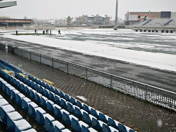 Gradski stadion u Prijedoru jutros je zatekao novi snježni prekrivač, a situacija je bila posebno zahtjevna jer teren nema hibridnu podlogu, što znatno otežava održavanje u zimskim uslovima.