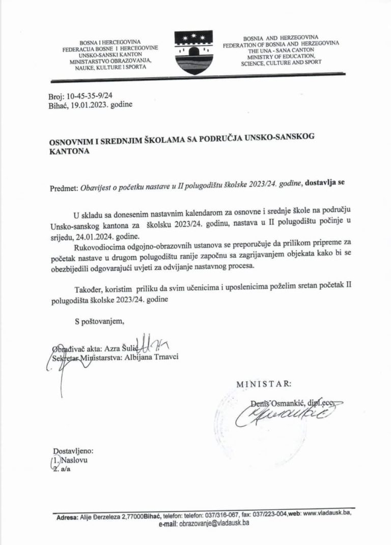 Nastava u osnovnim i srednjim školama Unsko-sanskog kantona počinje u srijedu, 24. januara. Kako je saopćeno uz Ministaratva obrazovanja, nauke, kulture i sporta, ispunjeni su svi uslovi za početak drugog polugodišta, tako da će učenici nakon troiposedmičnog zimskog raspusta ponovo sjesti u školske klupe.