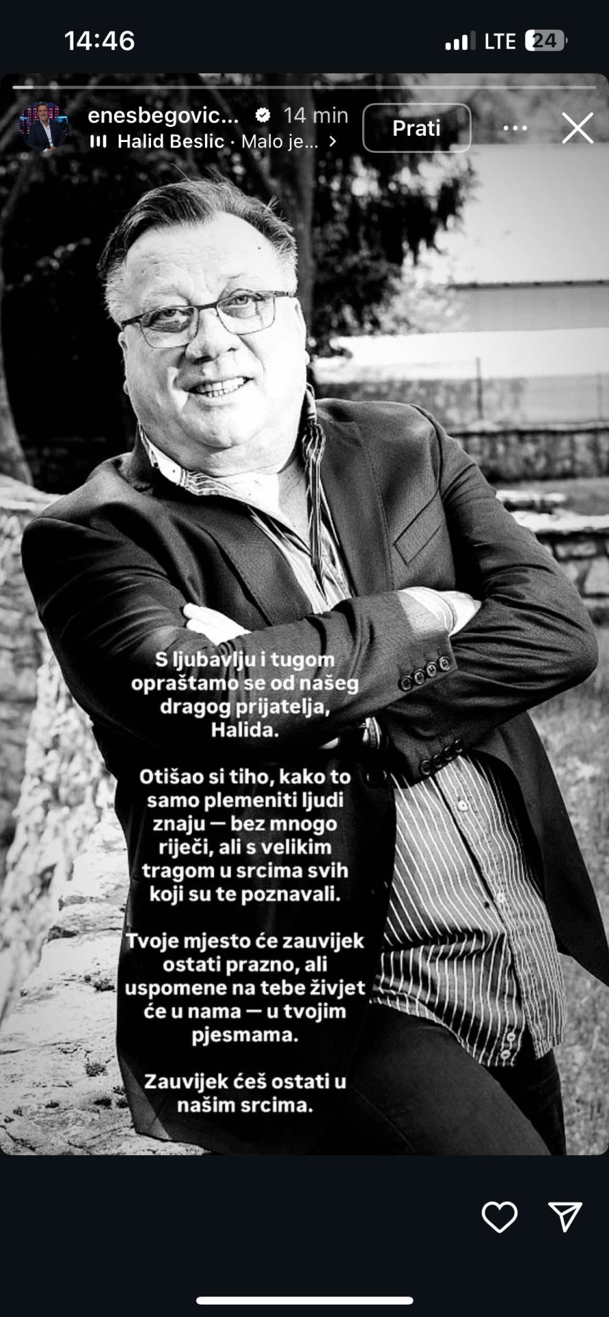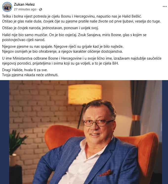 Otišao je Halid Bešlić – čovjek iz naroda, dobri duh ovih prostora. Otišao je ponos Bosne i Hercegovine, simbol onog što jesmo – topli, prkosni, ponosni.