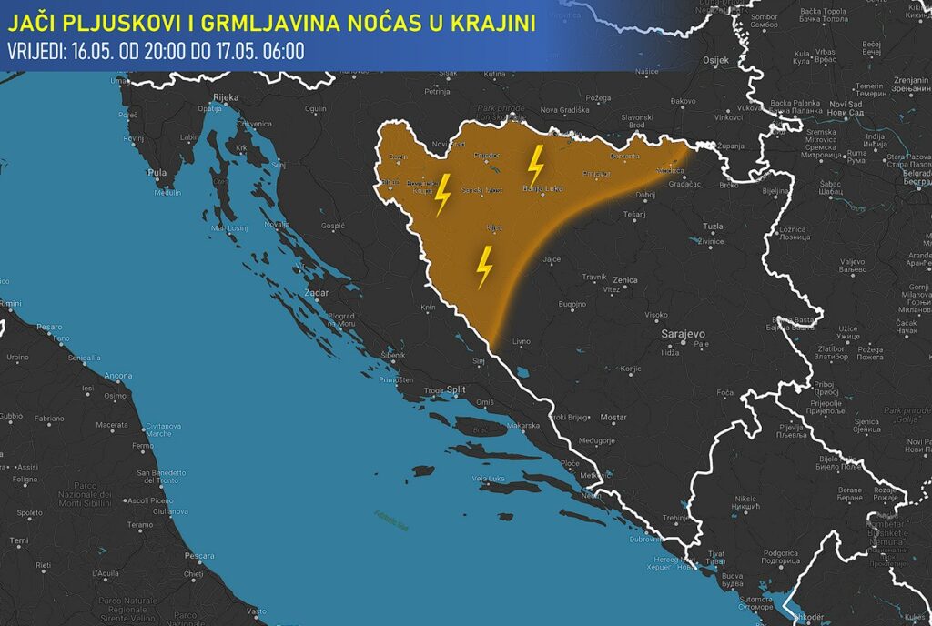 Večeras iza 20 sati i u noći na petak(17.05.) uz jak razvoj konkvetivne oblačnosti veći dio USK te djelimično sjever Bosne očekuju jača kiša i pljuskovi sa grmljavinom.
