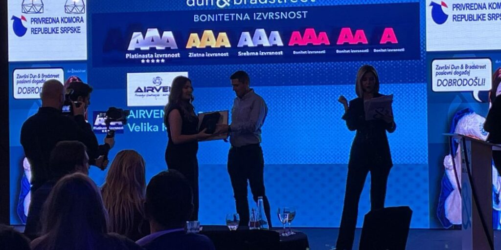 Poslovni subjekat koji spada u platinasti razred bonitetne izvrsnosti u Bosni i Hercegovini pripada grupi top poslovnih subjekata koji imaju pravo na upotrebu statusa Platinasta izvrsnost, kao simbola ocjene bonitetne izvrsnosti. Certifikat je “Airventu” u četvrtak, 14. decembra u Sarajevu uručila renomirana kompanija Dun&Bradstreet, najveći globalni pružatelj poslovnih podataka.